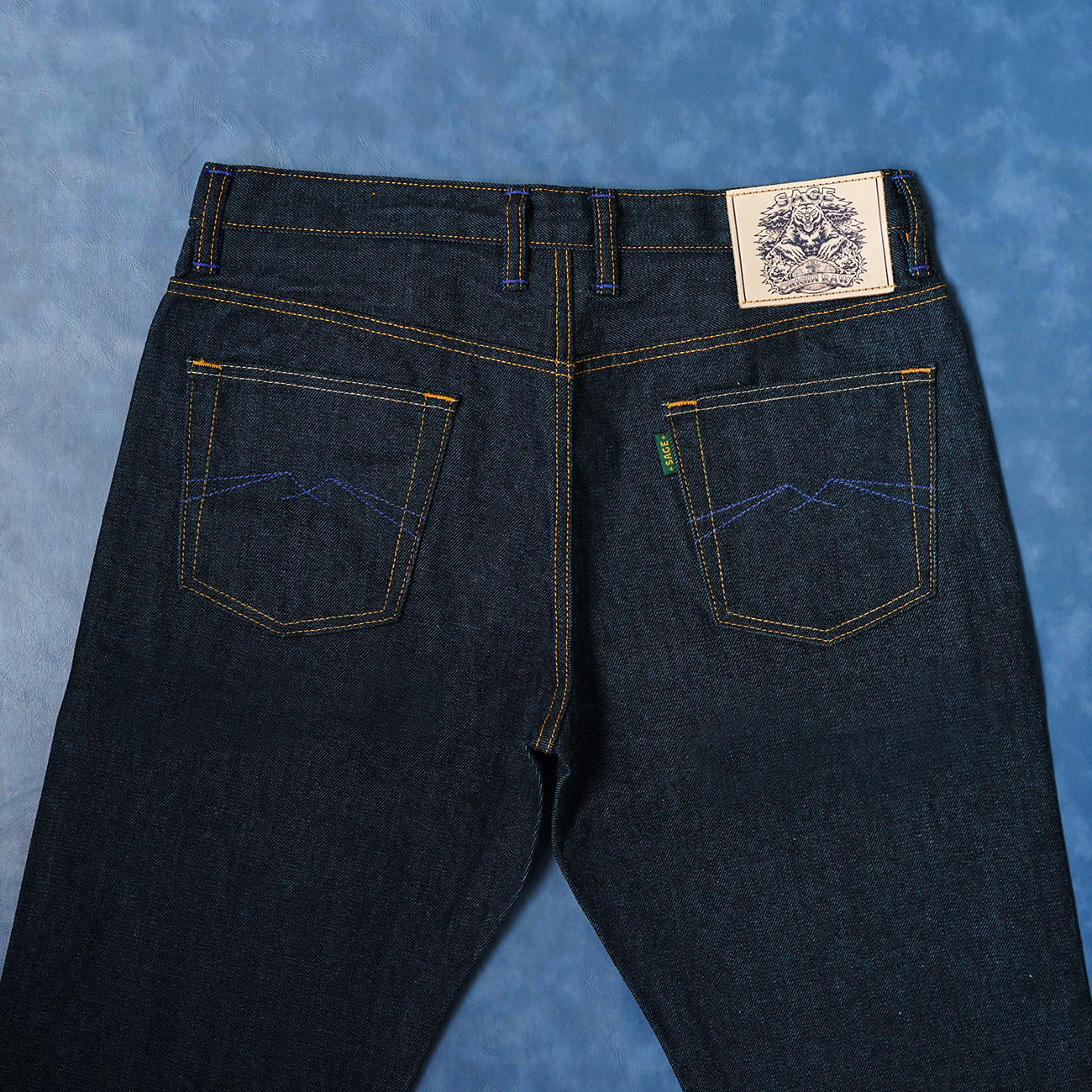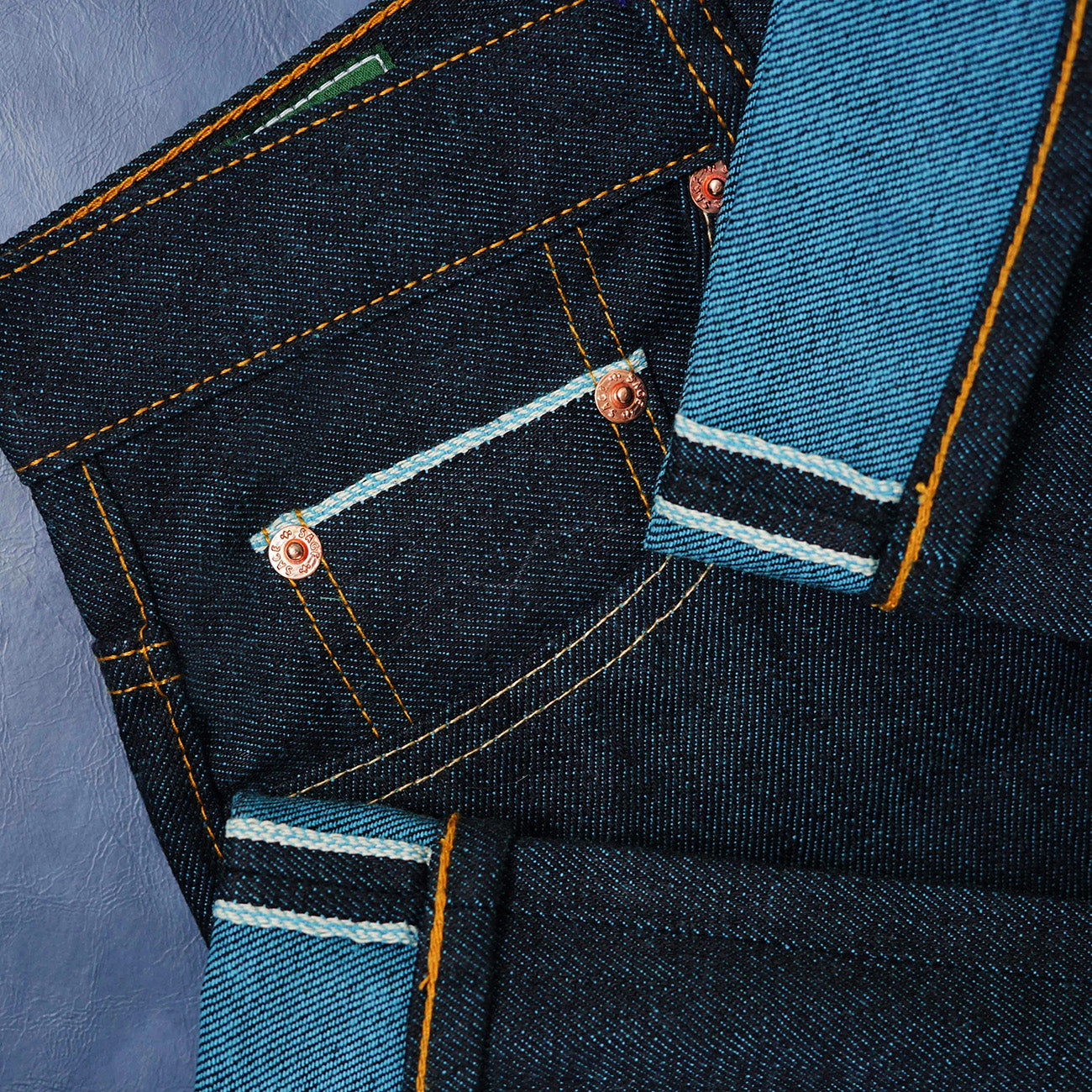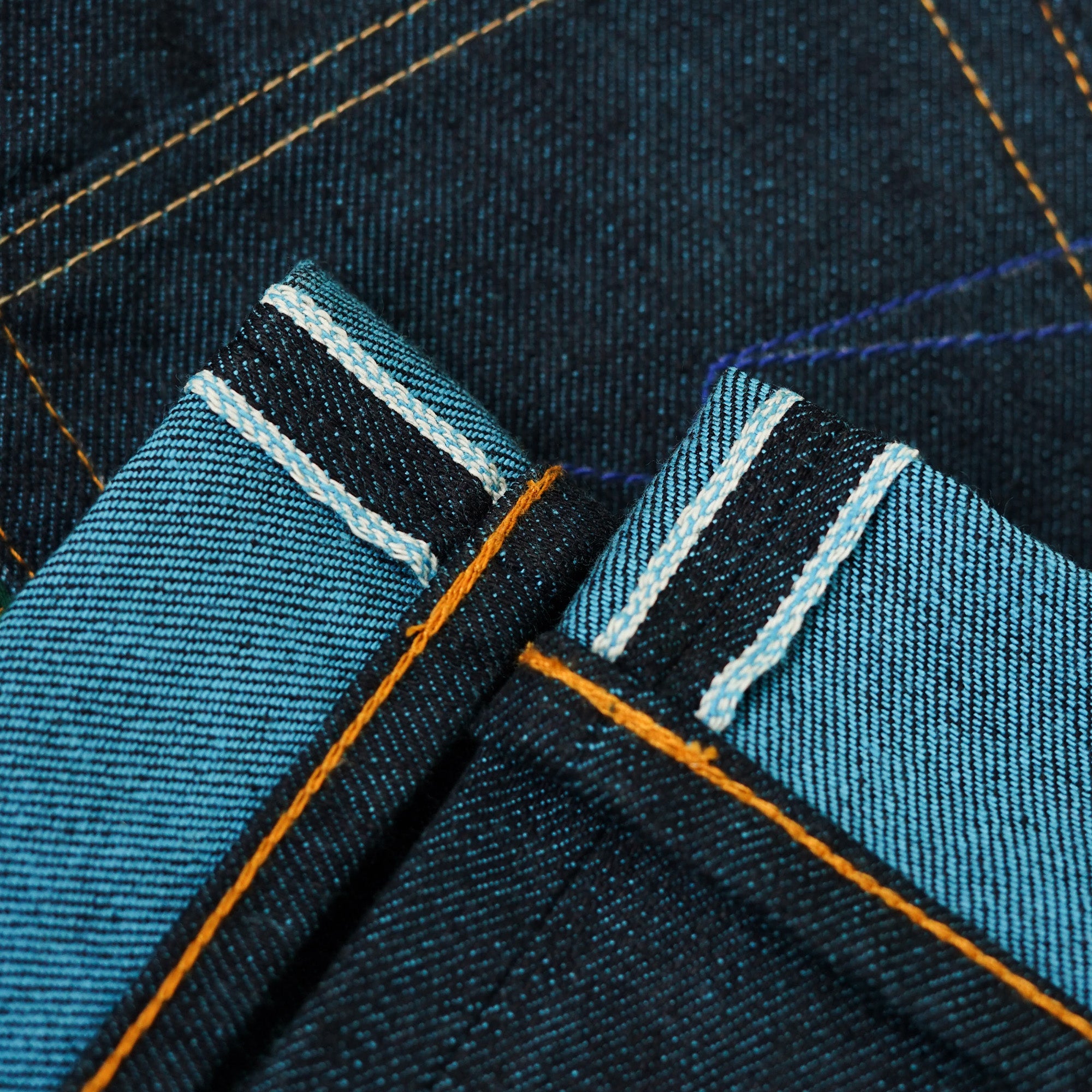 - 14oz unsanforized deep indigo x Aquamarine selvedge denim