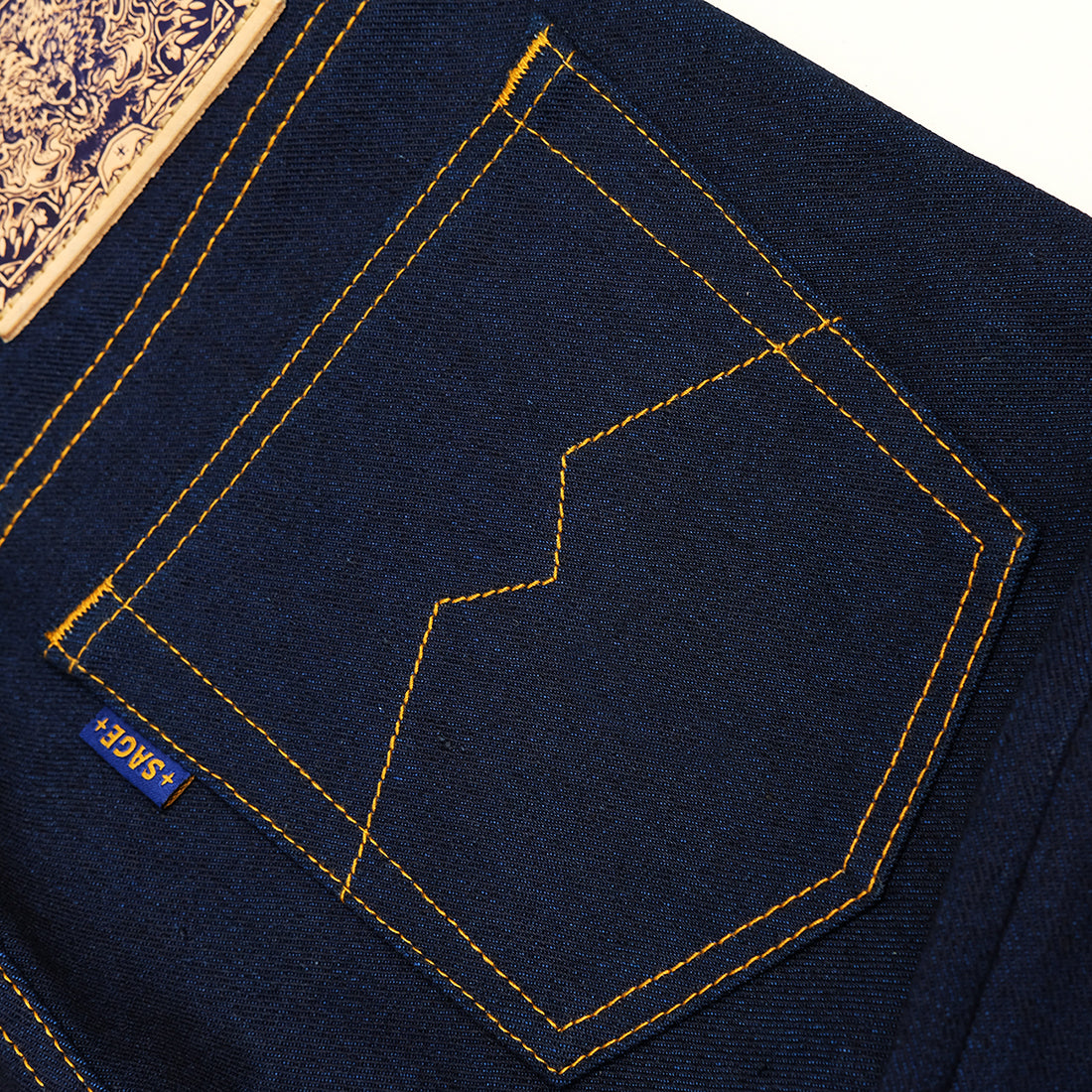 - 14oz sanforized deep indigo rope dyed projectile loomed denim