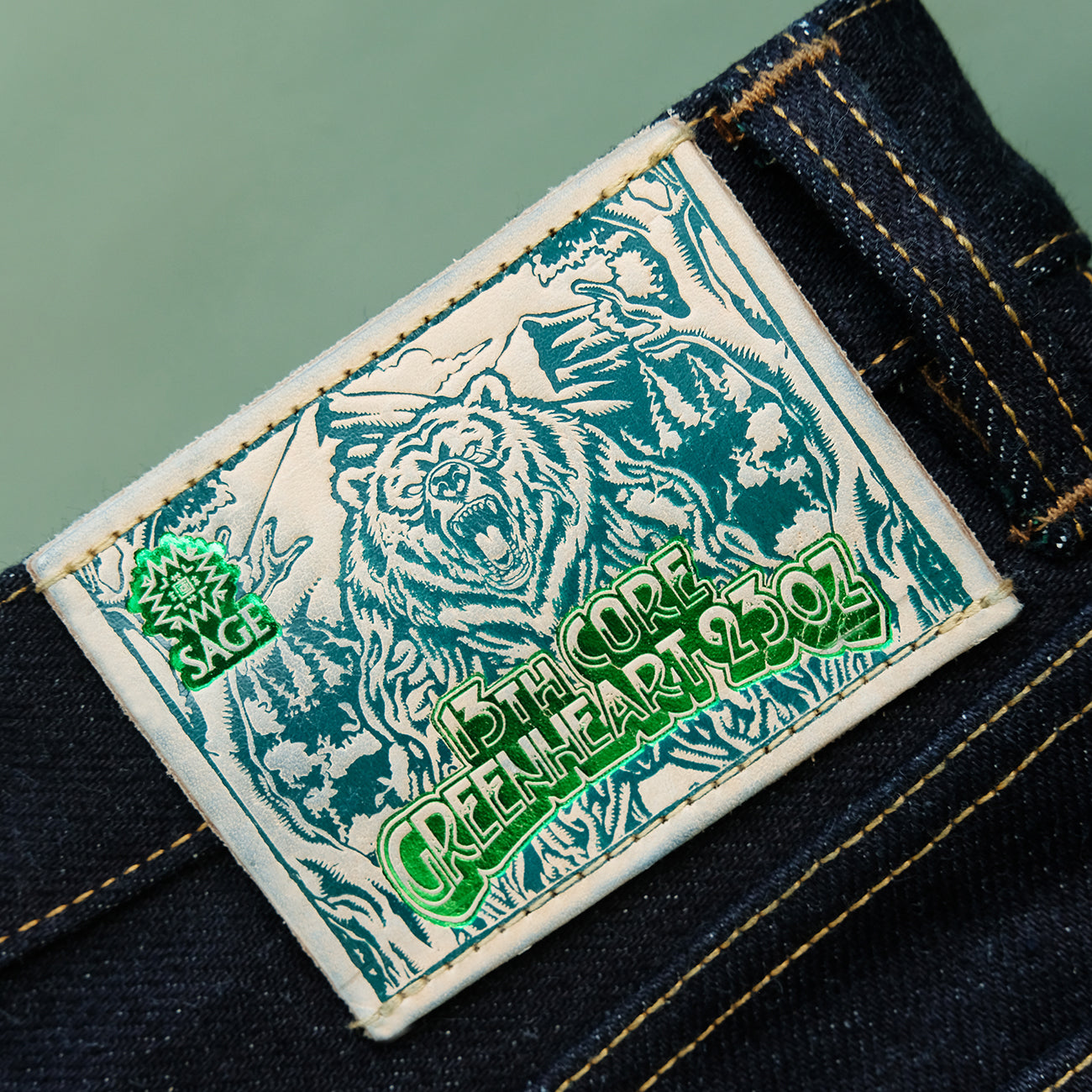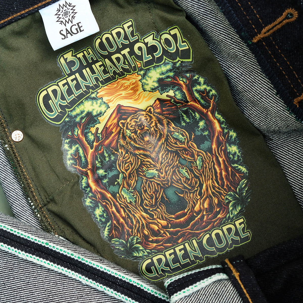 Sage Denim 13th Anniversary Special : The 13th Core Greenheart 23oz Unsanforized Deep Indigo Green Core Selvedge Denim